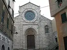 Begun by the Augustinians in 1260, it is one of the few Gothic buildings remaining in the city, after the numerous demolitions in the 19th century. It has a typical façade with bichrome stripes in white marble and blue stone, with a large rose window in the middle. Notable is the ogival portal with, in the lunette, a fresco depicting St Augustine by Giovanni Battista Merano. At the sides are two double mullioned windows.