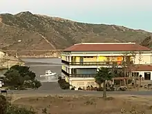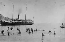 During World War II, the island was closed to tourists and used for military training facilities.[14] Catalina's steamships were expropriated for use as troop transports and a number of military camps were established. The U.S. Maritime Service set up a training facility in Avalon, the Coast Guard had training at Two Harbors, the Army Signal Corps maintained a radar station in the interior, the Office of Strategic Services did training at Toyon Bay, and the Navy did underwater demolition training at Emerald Bay.[1][15]