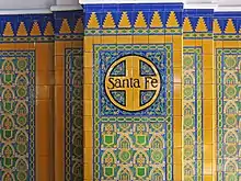 The massive arch of the front entrance is flanked by twin campaniles, each topped by a colorful tile-covered dome and displaying Santa Fe's blue "cross" emblem on all four sides. The structure draws much more heavily from the architecturally distinctive Spanish, Moorish, and Mexican lines exhibited by the Mission San Luís Rey de Francia (located in the town of Oceanside in north San Diego County) than it does from the nearby Mission San Diego de Alcalá, some nine miles (14 km) away. The grand interior space of the depot features natural redwood beam ceilings, highlighted by walls covered with a brightly colored ceramic tile wainscot. The glazed faience tile used in the wainscot was manufactured by the California China Products Company of nearby National City. Elaborate Hispano-Moorish designs are executed in green, yellow, blue, white, and black and the bottom and top edges are finished with a frieze of stylized ziggurats.[1]