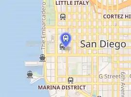 The historic depot is located in the Core district of Downtown San Diego and is still an active transportation center, providing services to Amtrak intercity trains, Coaster commuter rail trains, the San Diego Trolley, and the San Diego Metropolitan Transit System bus system.