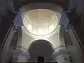 By 1654, the old church was threatening collapse, and reconstruction was pursued under the designs of Cosimo Fanzago, which led to the domed church with a Greek cross layout we see today. Work was soon interrupted due to lack of funds. There is evidence of a paleochristian basilica in the crypt, and the finding of an old stone carved with a cross gave the church part of its name. The bell tower was constructed in the 11th century.[2]