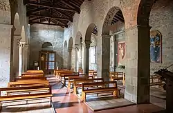 The exterior is plain. The interior has columns with sculpted capitals. The church contains a fresco depicting an Enthroned Madonna with Child Blessing attributed to Paolo Schiavo. The main altar now contains bas-reliefs with Life of Mary (2008) by Mauro Capitani.[1] Frescoes near the entrance are attributed to Luberto da Montevarchi.