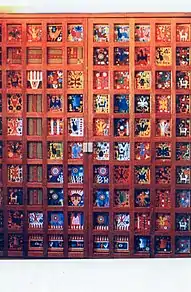 Pensamiento y alma huichol was created in 1997 for Palais Royal-Musée du Louvre station as part of the RATP - Mexico City Metro alliance. This is his most renowned and talked about work, which represents huichol deities, ancestors, myths, flora and fauna on a horizontal tripctic of the underground, the earth and the sky. The work is composed by 80 boards and elaborated with two million beads of 2 millimeters each one. It is located at the Palais-Royal Musée du Louvre towards the Carrousel du Louvre. On this work, researcher Miguel Gleason comments on his book México insólito en Europa: “Its perhaps the most impressive and detailed work in Europe, composed by more of 2 million beads that shows the cosmogony of that community (huichol people)”.[3]