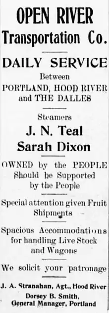In November 1897, plans were being made to run Sarah Dixon on the Portland-The Dalles route for the White Star line under captain George W. Shaver.[35]