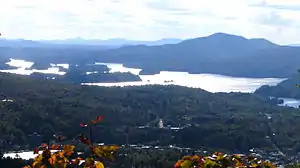 The village of Saranac Lake covers parts of three towns (Harrietstown, St. Armand, and North Elba) and two counties (Franklin and Essex). The county line is within two blocks of the center of the village. At the 2010 census, 3,897 village residents lived in Harrietstown,[4] 1,367 lived in North Elba,[5] and 142 lived in St. Armand.[6] The village boundaries do not touch the shores of any of the three Saranac Lakes; Lower Saranac Lake, the nearest, is a half mile west of the village. The northern reaches of Lake Flower, which is a wide part of the Saranac River downstream from the three Saranac Lakes, lie within the village. The town of Saranac is an entirely separate entity, 33 miles (53 km) down the Saranac River to the northeast.