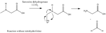 The demethylation of sarcosine catalyzed by sarcosine dehydrogenase can proceed with or without the presence of tetrahydrofolate.[11] Under anaerobic condition and without tetrahydrofolate, however, a free formaldehyde is formed after the N-demethylation of sarcosine.[12] The reaction with 1 mole of sarcosine and 1 mole of FAD, under this condition, yields 1 mole of glycine and 1 mole of formaldehyde (See figure 2 for mechanism).[9]