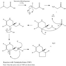 Under the presence of tetrahydrofolate, sarcosine dehydrogenase binds to tetrahydrofolate and convert tetrahydrofolate to 5,10-methylenetetrahydrofolate. Tetrahydrofolate here serves as a 1-carbon acceptor during the demethylation process (See figure 3 for mechanism).[2]