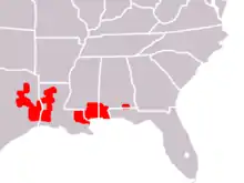 Like all Sarracenia species, Sarracenia alata is native to the New World and grows in permanently wet and open wetlands typically classified as longleaf pine (Pinus palustris) savannas. The Pale pitcher plant's habitat is split into two geographically separate areas: an eastern range from eastern Louisiana across southern Mississippi and into western Alabama and a western range from eastern Texas into western Louisiana.[1] In Mississippi, stands of Sarracenia alata rival in size those of any other Sarracenia species.