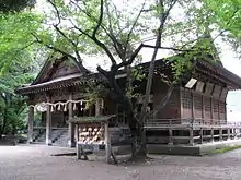 Saruka Jinja (猿賀神社), sometimes rendered Saruga, is a Shinto shrine in Hirakawa, Aomori Prefecture, Japan. The shrine is said to have been founded in 807, when Sakanoue no Tamuramaro came north during the campaigns against the Ezo.[1][2] The Honden, dating to 1826, is a Prefecturally-designated Important Cultural Property.[3][4] Preserved building records (棟札) are a City-designated Important Cultural Property (Historic Materials).[5] There is an annual rice-planting festival and a pond of pink lotus.[2] The main kami enshrined here is Kamitsukenokimitaji no mikoto (上毛野君田道命).