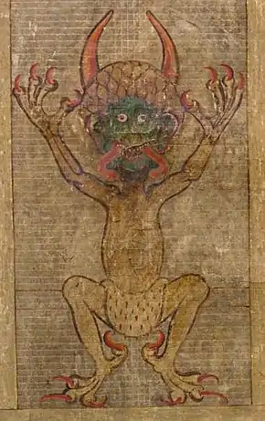 Satan had minimal role in medieval Christian theology,[138] but he frequently appeared as a recurring comedic stock character in late medieval mystery plays, in which he was portrayed as a comic relief figure who "frolicked, fell, and farted in the background".[138] Jeffrey Burton Russell describes the medieval conception of Satan as "more pathetic and repulsive than terrifying"[138][139] and he was seen as little more than a nuisance to God's overarching plan.[138] The Golden Legend, a collection of saints' lives compiled in around 1260 by the Dominican Friar Jacobus de Voragine, contains numerous stories about encounters between saints and Satan,[140] in which Satan is constantly duped by the saints' cleverness and by the power of God.[140] Henry Ansgar Kelly remarks that Satan "comes across as the opposite of fearsome."[141] The Golden Legend was the most popular book during the High and Late Middle Ages[142] and more manuscripts of it have survived from the period than for any other book, including even the Bible itself.[142]