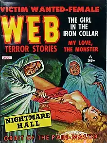 The detective stories began as hard-boiled fiction, with an emphasis on violence, sex, and titles such as "Jealous Husband" and "Rumble Bait".[8][10] Edward D. Hoch's "Murder is Eternal", described by mystery critic Jon Breen as "very grim", appeared in the August 1960 issue.[11] With the title change to Web Terror Stories in 1962, the magazine moved further towards sex and sadism as Sproul began publishing weird menace fiction:[6] this was a genre originally popular in the 1930s in which apparently supernatural powers are revealed to have a logical explanation at the end of the story.[12] The occasional science fiction or fantasy story still appeared: the August 1962 issue included "My Love, the Monster" by John Jakes, and Marion Zimmer Bradley's "Treason of the Blood", a vampire story; a third sf story, "Orbit of the Pain-Masters", by Arthur P. Gordon, is described by Sanders and Ashley as "dreadful even by old pulp standards".[6] Subsequent issues, in Sanders' and Ashley's words, "relied on various ways of torturing women" for their material.[6]