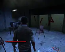 At certain points in the game, the player will be joined by AI teammates that help Tapp. There are many points in the game where multiple paths are available that can be taken to avoid certain areas or uncover hidden items.[3] Lighting plays a dynamic role in the game. While Tapp begins with a lighter, other light sources such as flashlights or camera flashes can be found later in the game. Minigames are a major part of the game. These include a searching game in which an X-ray view is used to avoid dangers like razors or syringes, and a game that involves grabbing a key before a "Pain meter" fills and wounds Tapp.[4] Other puzzle minigames include powering fuse boxes, placing rotating gears in a box, and aligning steam valves.[2] Doors rigged with shotguns attached to pulleys are in place all around the asylum. When the player encounters one of these doors, they must press a randomly assigned button before the pulley falls too far, or the gun will discharge. There are puzzles called "environmental traps", in which Tapp must use different elements in the environment, use the in-game camera, or go to certain locations to accomplish a task.[5]