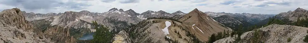 The northern Sawtooth Range formed from the Eocene Sawtooth batholith, while south of Alturas Lake the mountains formed from the Cretaceous granodiorite of the Idaho Batholith.[6][7] The Sawtooth Range has a history of alpine glaciation, but while no surface glaciers exist today, perennial snow fields and rock glaciers remain, usually on north or east facing slopes. There have been 202 perennial snow fields mapped in the Sawtooth Range.[8] The Sawtooth Range was last extensively glaciated in the Pleistocene, but glaciers probably existed during the Little Ice Age, which ended around 1850 AD.[9][10] Evidence of past glaciation given remnants of the glaciers such as glacial lakes, moraines, horns, hanging valleys, cirques, and arêtes.[9]