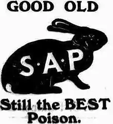 In 1902[1] the company began marketing this poison, which was, where laid, spectacularly successful against the rabbit pest. In 1906 the company purchased the recipe and manufacturing rights for "Rabbo", a similar product, from G. McGirr of Parkes, New South Wales.[2] An active ingredient of "S.A.P." was phosphorus, and was quickly suspected of starting grass fires, such that competing products such as "Vernox" were soon being marketed as being safer in this respect,[3] though "Vernox" and others such as "Deathtrail" and "Grim" all contained free phosphorus, in perhaps different concentrations. The advantage of phosphorus as a poison is that, in dry weather and if not strewn as clumps, it has degraded to innocuous phosphoric acid within a week and harmless to stock.[4]
