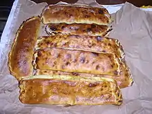 Scaccia (plural: scacce), scacciata or sciachiatta is a stuffed flat bread in Sicilian cuisine. Scaccia is made with a very thin rectangular layer of dough, folded on itself three or four times. It can be stuffed with different ingredients, the more common variations are ricotta cheese and onion, cheese and tomato, tomato and onion, or tomato and eggplant, depending on location, taste, or season. It is baked and can be eaten hot or cold. "Scacciata" derives from the Sicilian word meaning to drive away, equivalent to the Italian word "schiacciata" meaning to crush or to flatten. Scaccia can be found in Ragusa and Siracusa,[1][2][3][4][5] as well as some Sicilian-American communities (namely Middletown, Connecticut).[6][7][8]