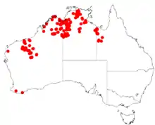 In the Northern Territory, it is found in the IBRA bioregions of Arnhem Plateau, Gulf Fall and Uplands, Gulf Plains, Northern Kimberley, Ord Victoria Plain, Pilbara, Pine Creek, Sturt Plateau, Tanami, Victoria Bonaparte.[5]