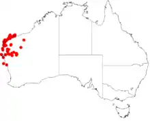 It is found in the IBRA Regions of Carnarvon, the Gascoyne, the Murchison, the Pilbara, and the Yalgoo, growing on sand, in sandhills and limestone rises.[3]