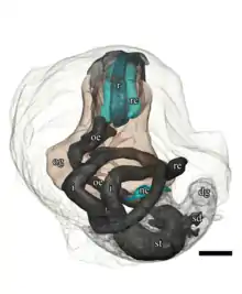 The reproductive system has some unusual features. The gonads of adult snails are not inside the shell; they are in the head-foot region on the right side of the body.[5] There are no gonads present in juveniles with shell length of 2.2 mm.[24] Adults possess both testis and ovary in different levels of development.[5] The testis is placed ventrally; the ovary is placed dorsally, and the nephridium lies between them.[5] There is a "spermatophore packaging organ" next to the testis.[5] Gonoducts from the testis and ovary are initially separate, but apparently fuse to a single duct, and emerge as a single genital opening on the right of the mantle cavity.[5] The animal has no copulatory organ.[2][5]