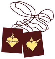 The Scapular of Our Lady of Mount Carmel (also known as the Brown Scapular) belongs to the habit of both the Carmelite Order and the Discalced Carmelite Order, both of which have Our Lady of Mount Carmel as their patroness.[1] In its small form, it is widely popular within the Latin Rite of the Catholic Church as a religious article and has probably served as the prototype of all the other devotional scapulars. The liturgical feast day of Our Lady of Mount Carmel, July 16, is popularly associated with the devotion of the Scapular.