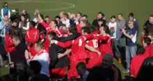 After a slow start to the following season, gaining just one point from the opening two league games, Scarborough Athletic then embarked upon a club record 27 match unbeaten league run which saw them surge to the top of the table. On 8 November 2008, Ryan Blott scored a club record five goals in a league match at Yorkshire Amateur. By the end of February 2009 the club had moved into a commanding lead at the top of the NCEL1 table and on 21 March 2009, following a 2–1 victory at Teversal, they were guaranteed promotion to the Northern Counties East League Premier Division (NCELP).[8] Three days later the club were confirmed as champions after a 3–0 win at home to Brighouse Town.[9][10]