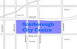 It is roughly bounded by Kennedy Road and Dorset Park to the west, Markham Road and Woburn to the east, Ellesmere Road and Bendale to the south, and Ontario Highway 401/Agincourt to the north. At its centre core is the Scarborough Civic Centre, Albert Campbell Square, Scarborough Town Centre shopping mall, and the Canada Centre Building.