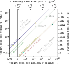 where Io is the initial flux, path length Δx ≡ x − xo, the second equality defines an interaction mean free path λ, the third uses the number of targets per unit volume η to define an area cross-section σ, and the last uses the target mass density ρ to define a density mean free path τ. Hence one converts between these quantities via Q = 1/λ = ησ = ρ/τ, as shown in the figure at left.