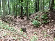 The Alte Burg on the peak of the Reuschberg is a sort of circular rampart, with remains of both earth and masonry walls, long thought to date to the La Tène period. However, excavations in 2005 indicate that it most likely is a 10th-century refuge castle, with some elements added later (11th or 12th century). Over the centuries, locals have used the fortification as a source of construction materials, reducing the remains to just foundations. The fortifications are roughly oval in form and encompass an area of roughly 1,300 square meters. A break in the wall likely once served as a gate. Research also revealed signs of internal buildings, including the foundation of a central tower.[4][5]: 24
