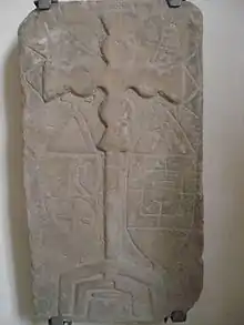 The church St. Katharina in Ernstkirchen was mentioned first in 1184. In the 14th century, the original Romanesque church was reconstructed with a Gothic vaulted ceiling and an octagonal tower. Over the centuries, the church was redesigned several times in different styles (Baroque, Gothic Revical), but in 1958/67 the church was mostly returned to its early Gothic state (although the tower roof retains its Baroque onion shape). During this renovation, an early medieval stone tablet of unknown date was discovered, which indicates a very early ecclesial presence at this location. About one meter in height, stylistically, it has been linked to the Hiberno-Scottish mission. The tablet shows a Crux gemmate surrounded by other symbols that are hard to identify, including possible moon and sun symbols and a type of "checkers board". It likely was removed from a visible position in the church around the year 1300 and buried beneath the altar.[6][4][5]: 24–5