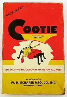 William Herbert "Herb" Schaper (1914—1980) was a Minnesota postman who created, developed, and manufactured a children's game known as Cootie.[3][4] After whittling a fishing lure in 1948, he molded the object in plastic, fashioned a game around it, and formed the H. W. Schaper Mfg. Co., Inc. to manufacture and publish the game. In the fall of 1949, the game was launched on the market,[4] and sold through Dayton's department stores.[2] Schaper sold 5,000 Cootie games by 1950, and over 1.2 million games by 1952.[2][5] In 2003 'Cootie' was named one of the top 100 most memorable and creative toys in the last century by the Toy Industry Association.[6]