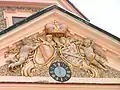 Close-up of coats of arms (left: Baden-Baden, right: Saxe-Lauenburg) and pebble dash used on walls