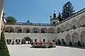 By 1400 the castle was expanded by a massive outer bailey, which included the previously built Gothic chapel of St. Catherine. The bailey was extended in the 15th century a number times. Mid-16th century, the castle was transformed into a residential building with Renaissance elements and expanded to accommodate the numerous offspring. In the 17th century the magnificent banqueting hall was built, the deep moat was built on. Mid-17th century the 'Florentinerhof' was constructed after an Italian model and by the end of the century St. George's Chapel, the gardeners home and the 'Maierhof' were completed.