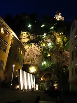 The summit is also accessible by an elevator. The elevator is accessible through a large tunnel under the mountain located under the steep stairs on Schlossbergplatz.[8][9]