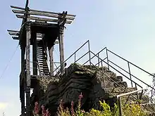 The group of rocks at the highest point on the mountain is called Backöfele ("baking oven"), after which the observation tower was named. In the Thirty Years' War, folk from the surrounding village are supposed to have fled to this place where they baked their bread.