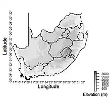 Schoenus arenicola mostly occurs near the south-western coast of South Africa, ranging from the Knysna area in the east to the Cape Peninsula in the west.[1] This species usually grows among fynbos vegetation at low elevations on well-drained sandy sites.[1]