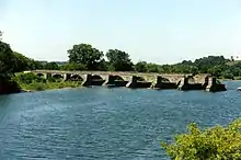 ![]() Nine remaining arches of the Schoharie Creek Aqueduct with the footpath on the left and the remains of the canal crossing on the right | |