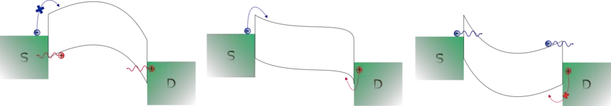 Introducing a second semiconductor/metal interface and a gate stack overlapping both junctions, one can obtain a Schottky barrier field effect transistor (SB-FET). The gate steers the carrier injection inside the channel modulating the band bending at the interface, and thus the resistance of the Schottky barriers. Generally the most significantly resistive path for the current is represented by the Schottky barriers, and so the channel itself does not contribute significantly to the conduction when the transistor is turned on. This kind of device has an ambipolar behavior since when a positive voltage is applied to both junctions, their band diagram is bent downwards enabling an electron current from source to drain (the presence of a voltage is always implied) due to direct tunneling. In the opposite case of a negative voltage applied to both junctions the band diagram is bent upwards and holes can be injected and flow from the drain to the source. Setting the gate voltage to 0 V suppresses the tunneling current and enables only a lower current due to thermionic events. One of the main limitations of such a device is strongly related to the presence of this current that makes it difficult to properly switch it off. A clear advantage of such a device is that there is no need for channel doping and expensive technological steps like ion implantation and high temperature annealings can be avoided, keeping the thermal budget low. However the band bending due to the voltage difference between drain and gate often injects enough carriers to make impossible a proper switch off of the device. Also, low on-currents due to the intrinsic resistance of the Schottky contacts are typical of this kind of device just like a very hard and unreliable scalability due to the difficult control of the junction area.