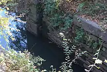 The Chester County Canal, also known as the Phoenixville Branch Canal,[15] was an addition to the Navigation built by the Schuylkill Navigation Company in 1828 to provide water power to a new nail works in Phoenixville. The new canal connected the slackwater pool of the Schuylkill Canal above the Black Rock Dam to Phoenixville. This canal paralleled the top end of the Oakes Reach, on the opposite side or the river. While the Chester County Canal was initially built to provide water power to the mill, in 1847 it carried scheduled passenger service between Phoenixville and Norristown.[16] The spring freshet of 1869 destroyed the mill "and very much injured the canal and its locks."[17]