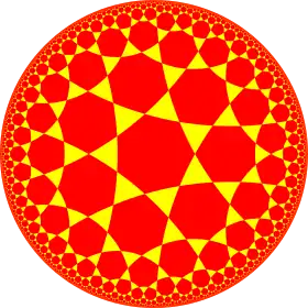 In mathematics, the Schwarz triangle tessellation was introduced by H. A. Schwarz as a way of tessellating the hyperbolic upper half plane by a Schwarz triangle, i.e. a geodesic triangle in the upper half plane with angles which are either 0 or of the form π over a positive integer greater than one. Through successive hyperbolic reflections in its sides, such a triangle generates a tessellation of the upper half plane (or the unit disk after composition with the Cayley transform). The hyperbolic refections generates a discrete group, with an orientation-preserving normal subgroup of index two. Each such tessellation yields a conformal mapping of the upper half plane onto the interior of the geodesic triangle, generalizing the Schwarz–Christoffel mapping, with the upper half plane replacing the complex plane. The corresponding inverse function, first defined by Schwarz, solved the problem of uniformization a hyperbolic triangle and is called the Schwarz triangle function.