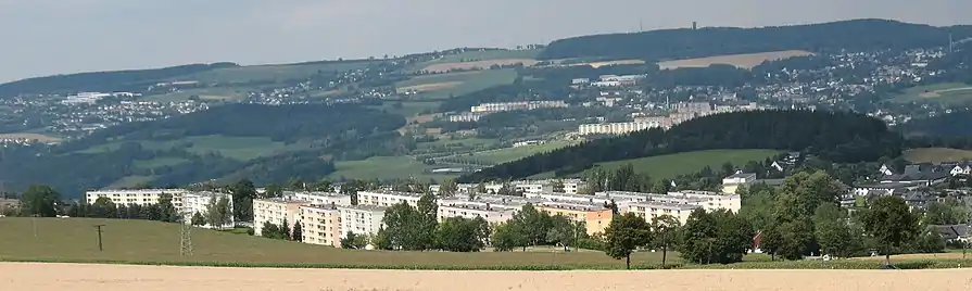 The Old Town with market square, castle and St.-Georgen-Kirche (main church) forms the town's historical core. The Vorstadt was originally a southward extension outside the (now vanished) town walls, originally formed around a mill. Late 19th century factories and workers' housing around the station became the Neustadt north of the Old Town, now housing the civic centre with town hall and employment centre. North-west and south-west of the Old Town, the Hofgarten and Heide low-rise residential areas were built in the 1960s and 1970s, respectively, using large-block construction (a precursor of plattenbau construction).[4] The plattenbau residential area Sonnenleithe at the town's northern border was built in the 1980s.