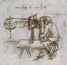 Other studies on this topic were later reinforced and widened by Panofsky (1940) and White (1957).[39] The Codex A[40] of the Institut de France includes the description of a technique to build an anamorphosis using a hole through which letting a ray of light project the shadow of what is to be drawn on a dedicated wall. This drawing technique is defined by Leonardo as "accidental perspective", in which farther objects needed to be drawn bigger than close ones, in contrast with what is observed in reality ("natural perspective").