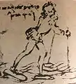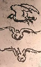 The two drawings can be adjusted when observed from a foreshortening angle, placing the eye on the right side of the sheet, about middle height. The original paper displays a preparation with a bundle of lines traced with a metal tip inside which the figures are inscripted; these lines are invisible in any reproduction.[36][37][38] A chapter in the Codex Arundel 263 (c.62, 9r.) with the title "On natural perspective mixed with accidental perspective" explains how to apply an accidental viewpoint to that of a natural surface, in order for the moving observer to obtain the vision of a "monstrous" figure. This was the procedure used to accomplish the "Fight Between a Dragon and a Lion" and Painting with Horses, so peculiar as to attract the attention of Francis I of France demonstrating the presence of a geometric construction underlying the sketches, which can be seen in their real proportions only observing them with the usual technique needed for ‘anamorphic’ paintings.