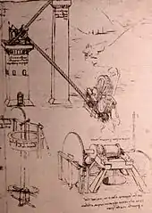 With the same rational and analytical approach that he used in anatomic studies, Leonardo faced the study and design of a bewildering number of machines and devices. He drew their "anatomy" with unparalleled mastery, producing the first form of the modern technical drawing, include a perfected "exploded view" technique, to represent internal components. Those studies and projects have been collected in his codices and fill more than 5,000 pages.[20] Leonardo was a master of mechanical principles. He utilized leverage and cantilevering, pulleys, cranks, gears, including angle gears and rack and pinion gears; parallel linkage, lubrication systems and bearings. He understood the principles governing momentum, centripetal force, friction and the aerofoil and applied these to his inventions. His scientific studies remained unpublished with, for example, his manuscripts describing the processes governing friction predating the introduction of Amontons' laws of friction by 150 years.[21]