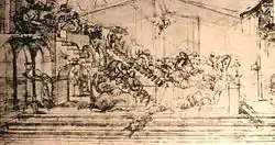 The unfinished Adoration of the Magi was intended to be a masterpiece revealing much of Leonardo's knowledge of figure drawing and perspective. There exists a number of studies that he made, including a detailed study of the perspective, showing the complex background of ruined Classical buildings that he planned for the left of the picture. In addition, Leonardo is credited with the first use of anamorphosis, the use of a "perspective" to produce an image that is intelligible only with a curved mirror or from a specific vantage point.[18]
