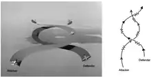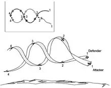 More typically what happens next in the rolling scissors is that the initial attacker, aware of their vulnerability caused by the overshoot, also rolls their aircraft, and pulls their nose toward the defender's aircraft. Due to the two components of the initial overshoot (vertical and horizontal), if the pilots keep attempting to turn their noses toward their opponent, then energy management, elements of roll and turn (as in the flat scissors; although in the rolling scissors there are no reverses of turn), as well as climbs and descents will be required to maintain maneuvering that might, if successful, result in a position from which a shot can be made. What evolves in the rolling scissors is a maneuver that is essentially two aircraft barrel-rolling around each other. The resulting maneuver often looks like two interwoven cork-screws or a double helix. The more barrel rolls that are flown in the rolling scissors, the more nearly the rolls become horizontal only, as each pilot attempts to deplete enough forward speed to place their fighter behind the other.