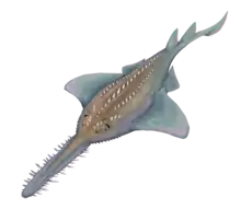 Sclerorhynchoidei is an extinct suborder of rajiform rays that had long rostra with large denticles similar to sawfishes and sawsharks. This feature was convergently evolved and their closest living relatives are actually skates.[6][7][8] While they are often called "sawfishes", sawskates is a more accurate common name for sclerorhynchoids. The suborder contains five named families: Ganopristidae, Ischyrhizidae, Onchopristidae, Ptychotrygonidae, and Schizorhizidae.[9] Several genera (see below) are not currently placed in any of these families. Sclerorhynchoids first appeared in the Barremian and went extinct during the Cretaceous–Paleogene extinction event, with former Paleocene occurrences being misidentifications or reworked specimens.[10][11]
