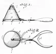 Alfred L. Cralle, a porter in a drug store and at a hotel in Pittsburgh, Pennsylvania,[2][3] noticed that servers at the hotel had trouble with ice cream sticking to serving spoons, and he developed an ice cream scoop.[4] On June 10 1896, Cralle applied for a patent on his invention. He was awarded patent 576,395 on 2 February 1897.[5] The patented "Ice Cream Mold and Disher," was an ice cream scoop with a built-in scraper to allow for one-handed operation.[6][7] Cralle's functional design is reflected in modern ice cream scoops.[8]
