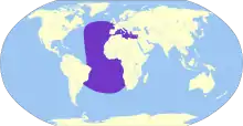 Scopoli's shearwater breeds on islands in the Mediterranean from the Chafarinas Islands off the Moroccan coast in the west to the Dodecanese near Turkey in the east. The largest colony is on the rocky island of Zembra, 13 km (8.1 mi) off the Tunisian coast. The colony contains between 141,000 and 223,000 breeding pairs which represents more than 75 percent of the global population.[17] Other large colonies are on the island of Linosa in the Strait of Sicily,[18] and on the Balearic Islands.[17]