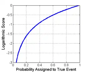 The image to the right shows an example of a scoring rule, the logarithmic scoring rule, as a function of the probability reported for the event that actually occurred. One way to use this rule would be as a cost based on the probability that a forecaster or algorithm assigns, then checking to see which event actually occurs.