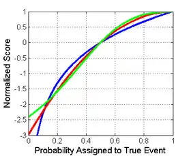 It is important to note that each of the scores have different magnitudes and locations. The magnitude differences are not relevant however as scores remain proper under affine transformation. Therefore, to compare different scores it is necessary to move them to a common scale. A reasonable choice of normalization is shown at the picture on the right where all scores intersect the points (0.5,0) and (1,1). This ensures that they yield 0 for a uniform distribution (two probabilities of 0.5 each), reflecting no cost or reward for reporting what is often the baseline distribution. All normalized scores below also yield 1 when the true class is assigned a probability of 1.