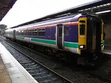 The brand was adopted by National Express when it took over the franchise from British Rail during privatisation in 1997.[4] The first unique ScotRail livery was introduced shortly after privatisation under National Express, who introduced its own livery. Initially, vehicles received the new ScotRail logo applied with vinyl stickers; a stylised outline of Scotland composed of three flashes in colours of green, red and purple.[5]